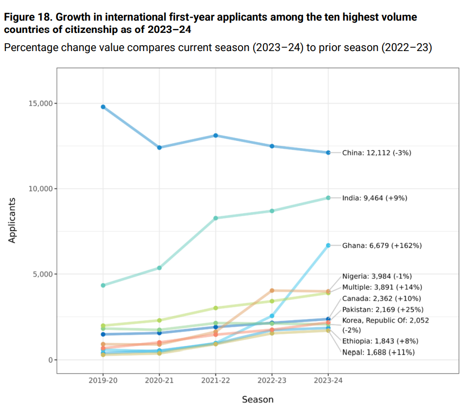据CA此前的官方数据显示,在2023-2024申请季,实际提交美国本科早申的新生达836,679人,相比于疫情前增长了41%。