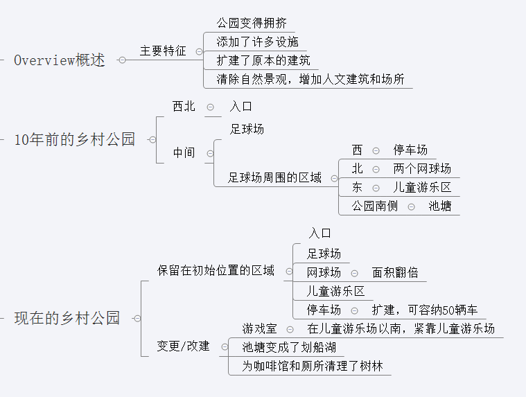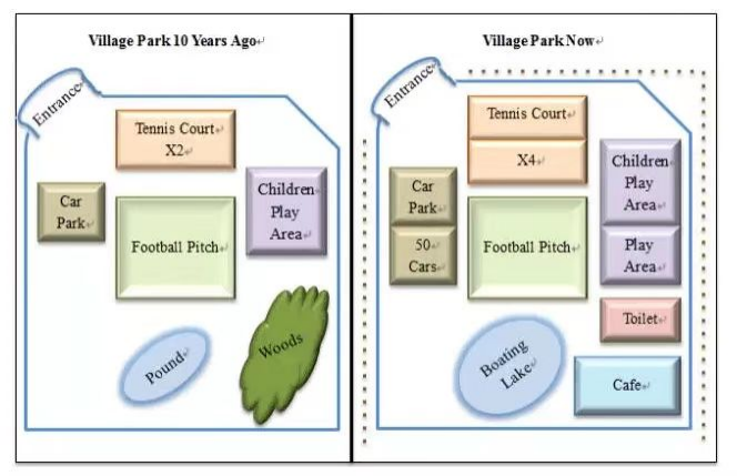 The two maps below give information of a village park between 10 years ago and now.Summarize the information by selecting and reporting the main features and make comparisons where relevant.