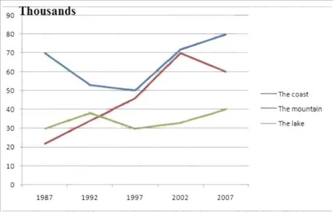 In particular, starting at 70 thousand and 30 thousand, successively, the figures for travelers to the coast and the lake lessened and climbed correspondingly between 1987 and 1992, but both of them declined by about 10,000 or less in the next five years. On the contrary, the level of those who visited the mountain soared from the lowest point of about 21 thousand to nearly 48 thousand in the first 10 years.
