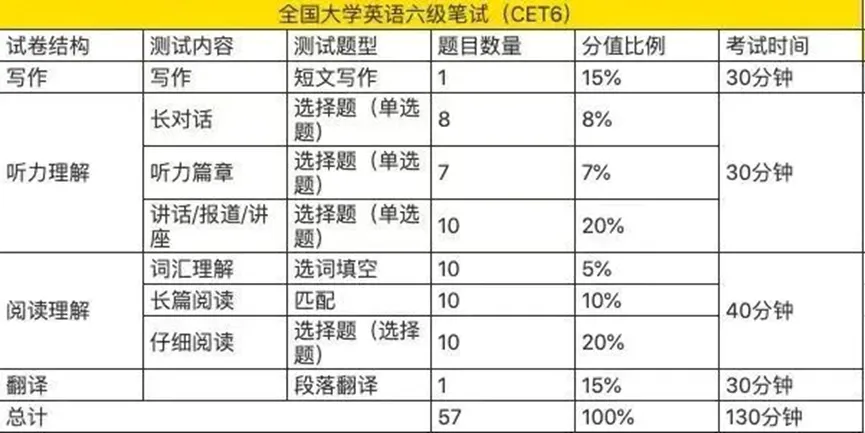 四六级考试主要分为写作、听力、阅读、翻译四大部分。要想拿到高分,四大部分的学习缺一不可。