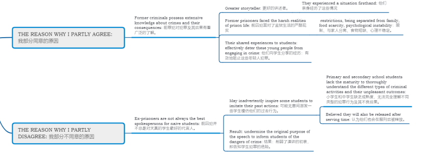In conclusion, although I believe that reformed prisoners can be effective speakers due to their firsthand experience, failing to consider students’ immaturity may encourage, rather than discourage, criminal behavior. Therefore, it is crucial to strike a balance and carefully assess whether schools should choose rehabilitated offenders to give talks on the risks of engaging in criminal activities.