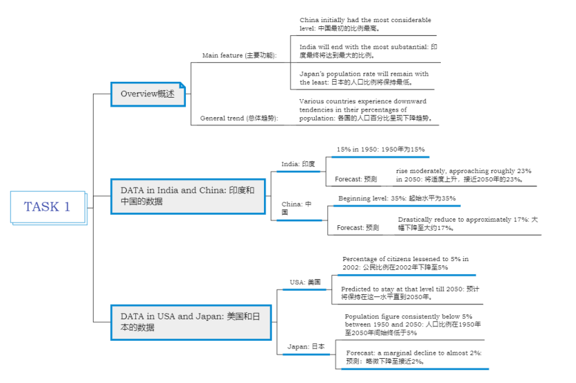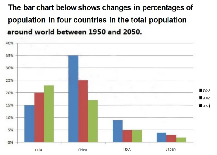 The bar chart below shows changes in percentages of population in four countries in the total population around world between 1950 and 2050.