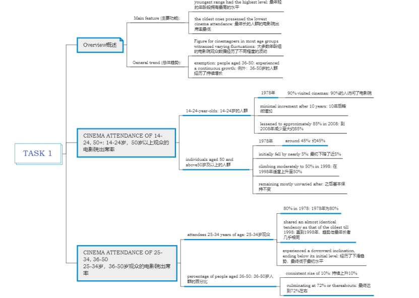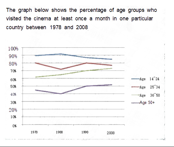 The graph below shows the percentage of age groups who visited the cinema at least once a month in one particular country between 1978 and 2008