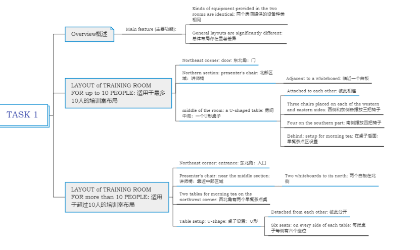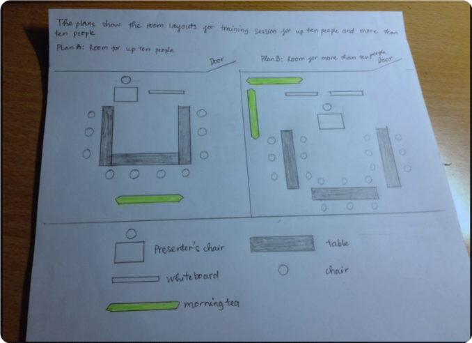 As for the other, it is designed to accommodate more than 10 partakers. The entrance to the venue is in the same corner. However, the presenter's chair is placed near the middle section, with two whiteboards to its north and two tables for morning tea on the northwest corner. The tables are set up as U as well, but they are detached from each other, and six seats are arranged on every side of each table.