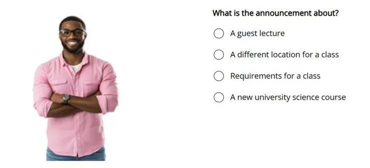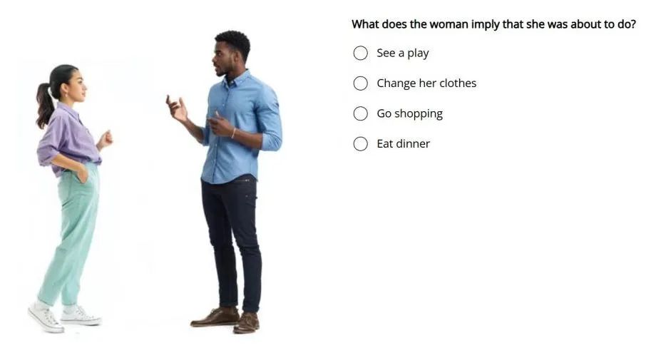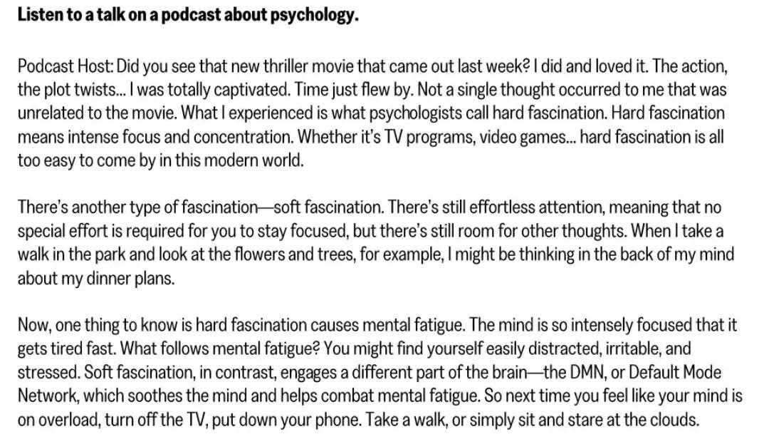 - 形式:30–45秒日常或学术对话,每段配2题(主旨+细节)。