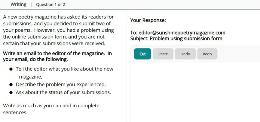 - 形式:根据情境写80–100词邮件,模板被官方“一键禁用”,粘贴无效。