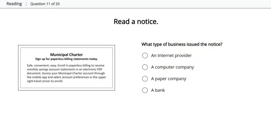 - 形式:15–120词真实场景文本(外卖通知、地铁广播、社媒评论),每篇2题。