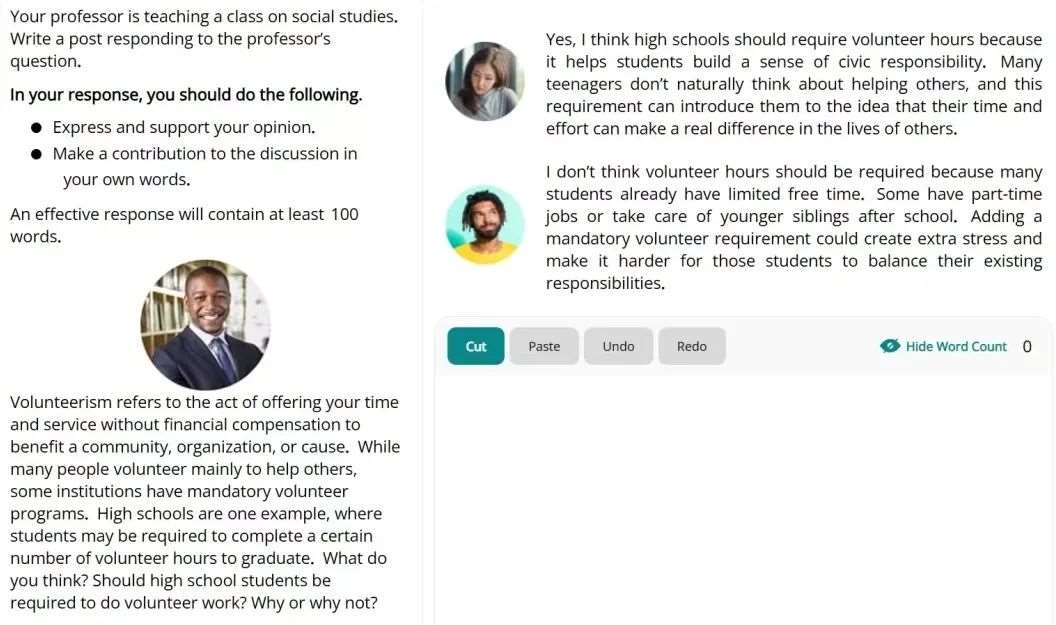 - 形式:论坛式界面,两位学生已发帖讨论一个开放问题,考生用120–150词加入讨论,支持或反驳任意一方并给出新论据。