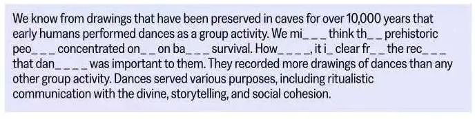 - 形式:70–90词短文,挖掉单词后半段字母,考生需键盘补全。