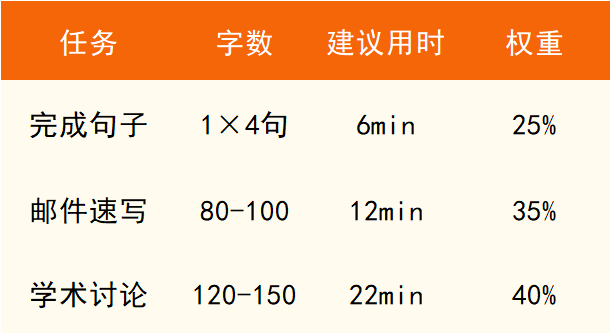 - 限时:每题90秒,共4题,占写作总分25%。