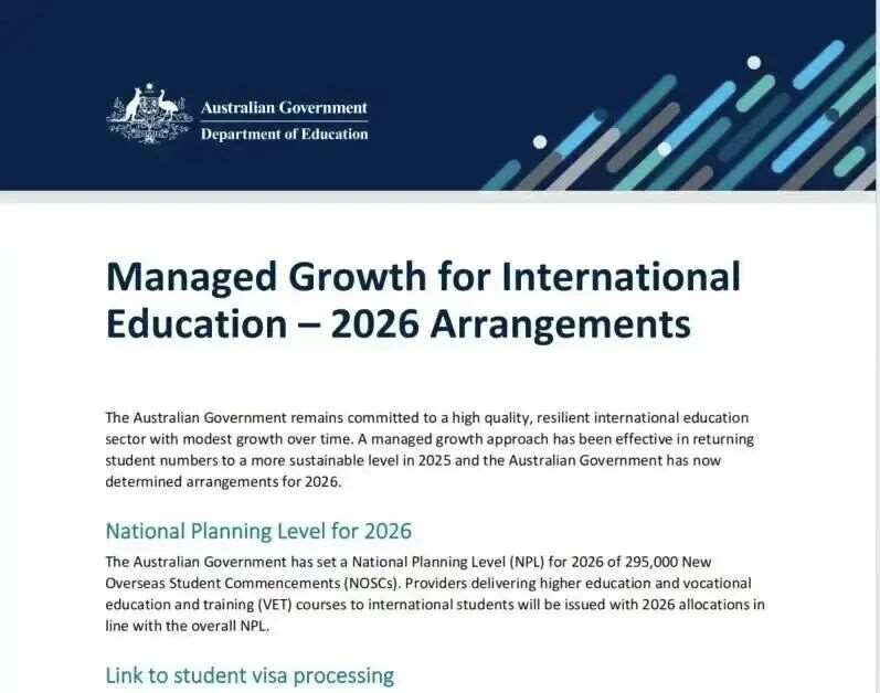 2025年《教育立法修正案》删除“留学生人数上限”条款,2026年国际学生招生规模预计扩容至29.5万人(较2024年增加2.5万) 。但别误解为“无节制扩招”——澳洲引入“国家规划水平”机制动态调控,通过签证审批节奏(如院校招生接近规划水平时,适当放慢签证速度)预警管理,既释放招生活力,又保障教育质量可控。