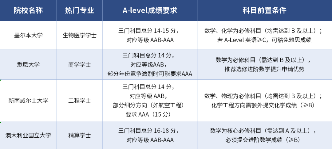 澳洲八大对A-level*有统一换算:A* =6,A=5,B=4,C=3,D=2,E=1 。申请时,不同专业差异体现在“总分要求+科目前置条件”,比如理工科常要求数学、物理科目,商科侧重数学、经济等。