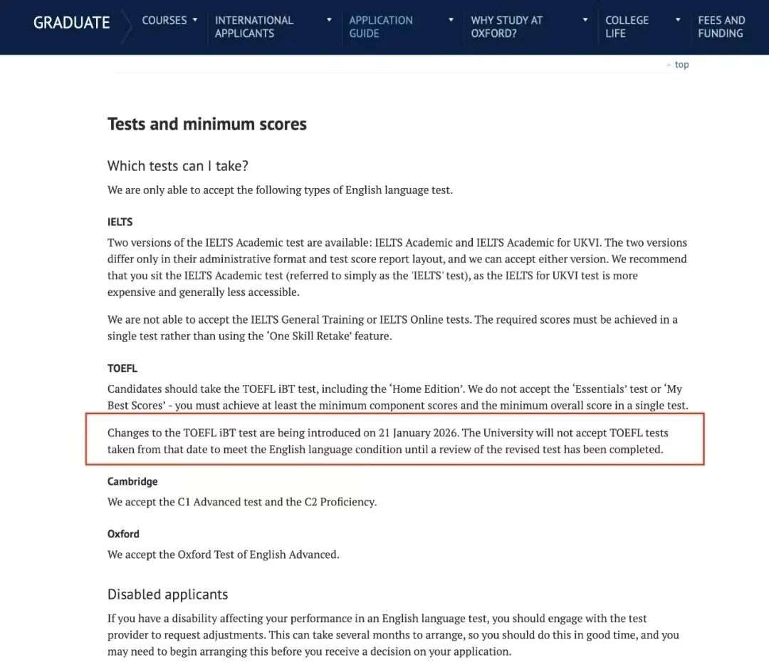 英国高校的语言要求迎来重要更新!近日,牛津大学通过官网发布通知,对研究生申请的英语语言证明要求做出调整,自2026年1月21日起,将不再接纳新版TOEFL iBT*作为语言能力凭证。