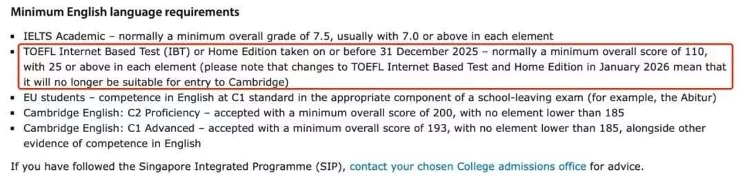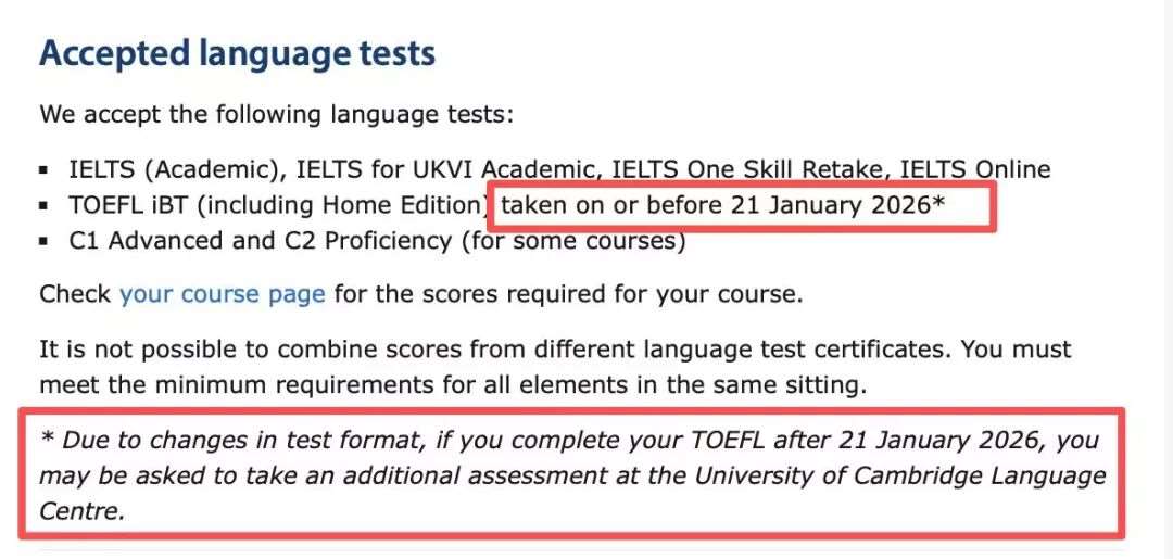 此前,剑桥就已经宣布,明确2026年1月之后取得的托福网考及家庭版*,不再作为本科课程语言能力证明,未提及评估后恢复接受的可能。政策比牛津覆盖范围更特殊,直接针对本科阶段申请,且态度更坚决。