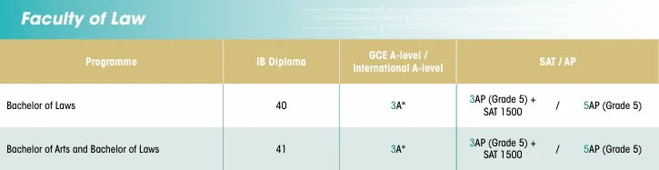 关键变动:仅IB要求上调,法学专业从39分涨至40分,文学与法学双学位从40分涨至41分;A-Level 始终稳定在3A*,无变化。