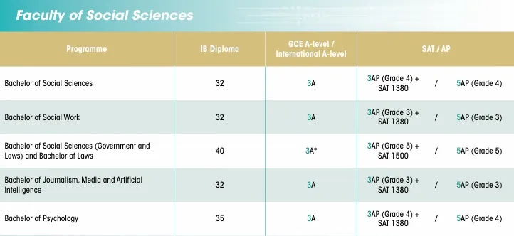 关键变动:无大幅调整,政府与法律 + 法学双学位门槛*高(A-Level 3A*+IB 40 分 + SAT1500),心理学专业需 A-Level 3A+IB 35 分,其余社会科学、社会工作专业维持 3A+32 分基础要求。