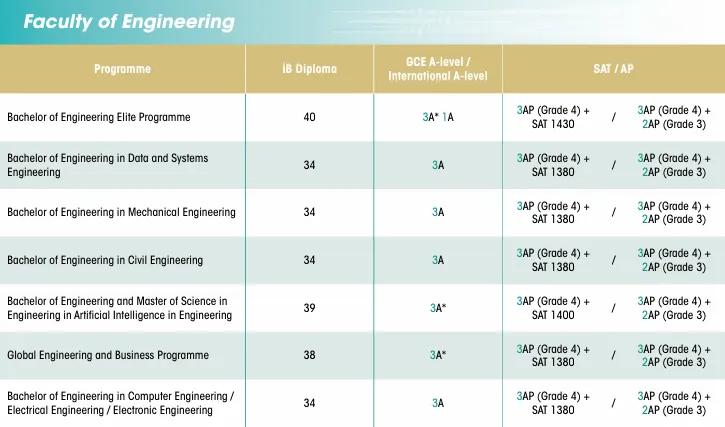 关键变动:工程精英项目涨幅*大,A-Level从3A跃升至3A*1A,IB 达 40 分;人工智能工程本硕项目、全球工程与商务项目 A-Level 需 3A,其余常规工程专业(机械、土木、计算机工程等)维持 3A 要求。