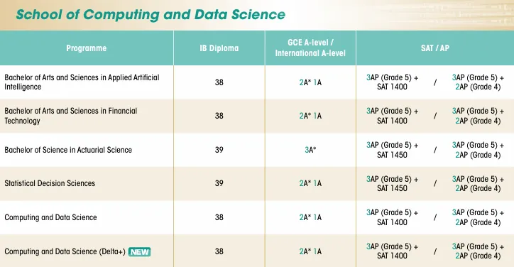 关键变动:应用人工智能专业门槛下降,IB 从39分降至38分,A-Level 从3A*降到2A*1A;金融技术、计算机与数据科学专业门槛上调,IB 从36分涨至38分,A-Level从3A涨至2A*1A;新增“计算机与数据科学(Delta+)” 专业,暂按2A1A+IB 38 分标准备考。