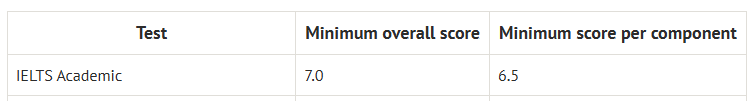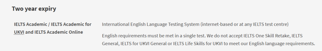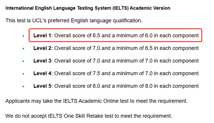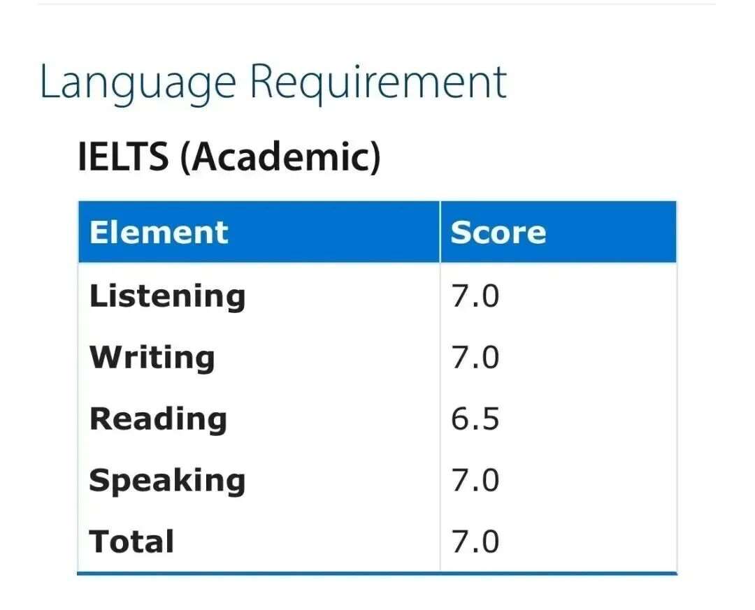 雅思要求:分两档,Standard档总分6.5(单项6.0),Higher档总分7.0(单项6.5),不接受单科重考。