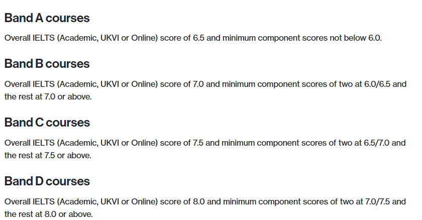 雅思要求:分4个档位,Band A(*低)总分 6.5(单项 6.0),Band D(*高)总分 8.0(单项 8.0),适配文科、商科等不同专业。