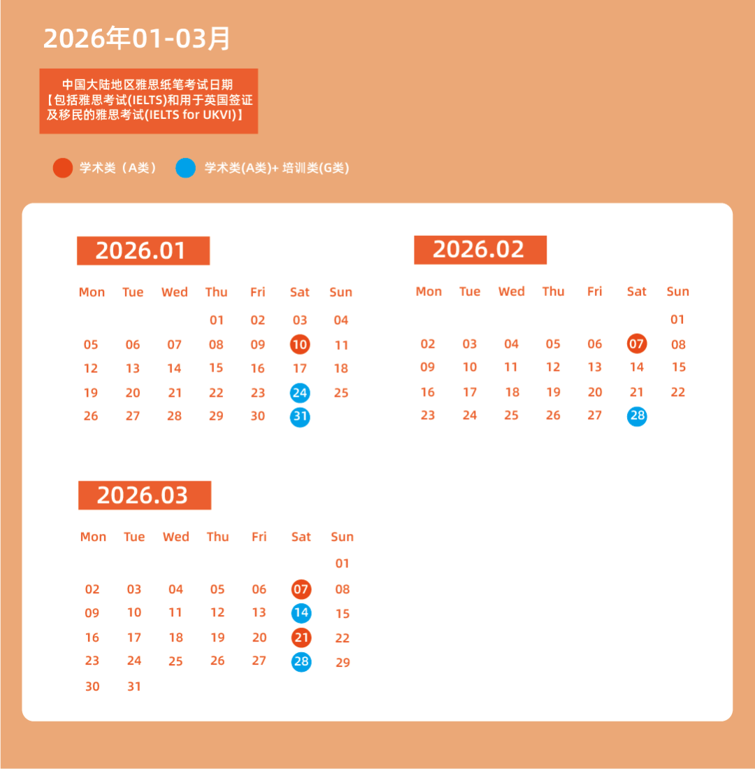 以上所有考试的纸笔形式及机考形式,2026年1-3月全部考试日期均已开放报名。考生可登录雅思考试报名网站(ielts.neea.cn),查询具体考试场次并完成报名操作。