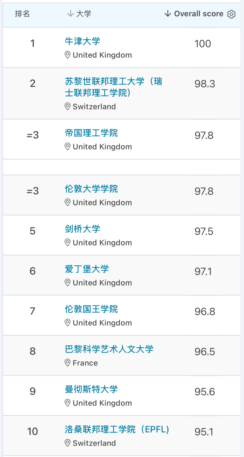 从整体格局来看,本次排名呈现“英国主导、多元互补”的特点:英国高校表现强势,不仅上榜总数位居欧洲首位,在榜单前十强中更是占据7席,展现出其在欧洲高等教育领域的优势;瑞士、法国各有2所、1所院校跻身前十,成为非英国留学的选择,共同构成欧洲高等教育第*梯队。