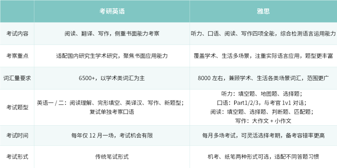 雅思和考研英语虽同为英语能力测评,但在考察方向、题型设置、应用场景上差异显著,却也存在不少可互通的学习基础,找准异同点,能让考研党备考雅思事半功倍,二者核心对比如下:
