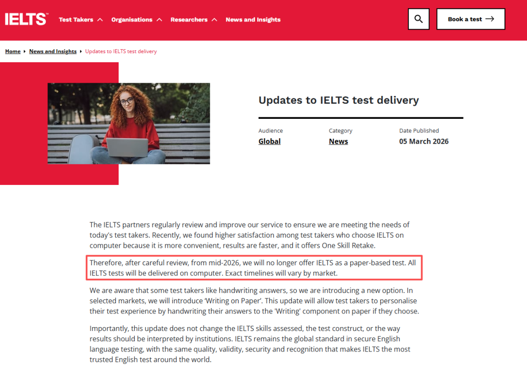 2026年3月5日,雅思全球官方于官网(ielts.org)重磅发布考试模式调整公告,正式官宣2026 年年中起全球雅思全面进入机考时代,这是雅思考试在交付形式上的一次全局性升级。